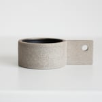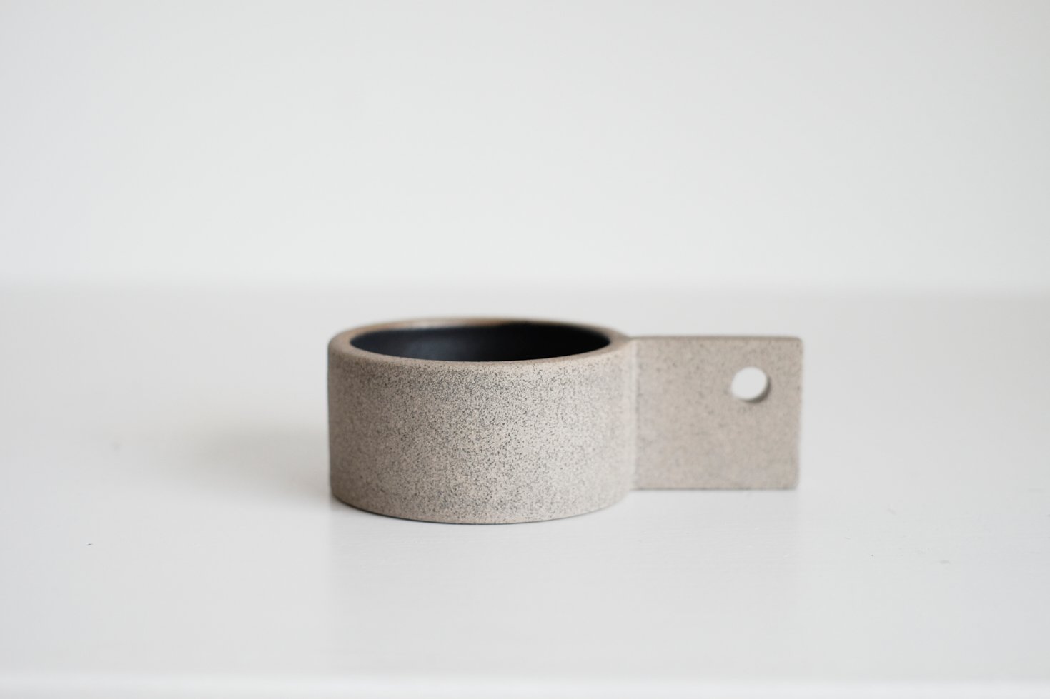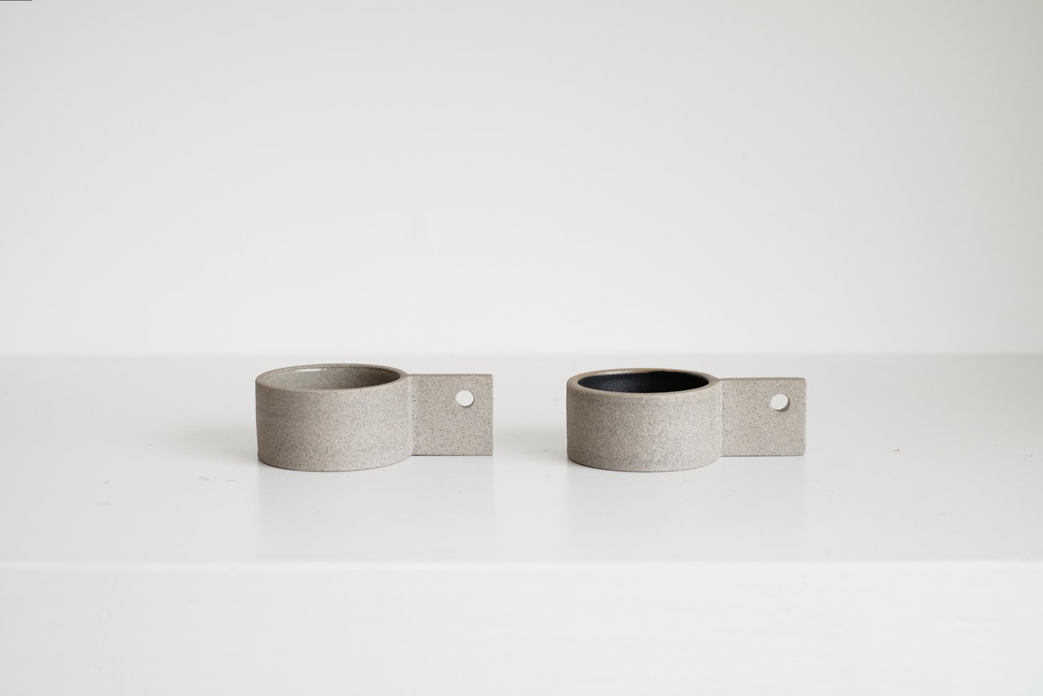 Handled espresso cups made from concrete grey clay, glazed black inside with raw clay exterior.