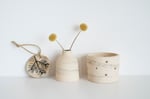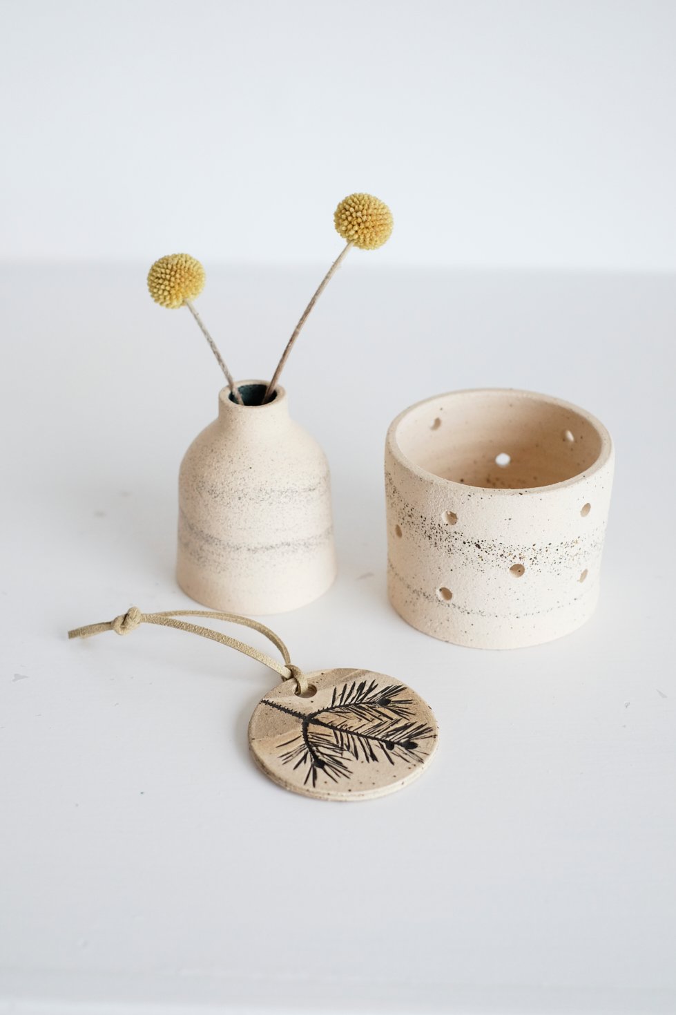 This gift box contains a Waternish sand mini bud vase, a Waternish sand tealight holder and a Douglas Fir hanging decoration.