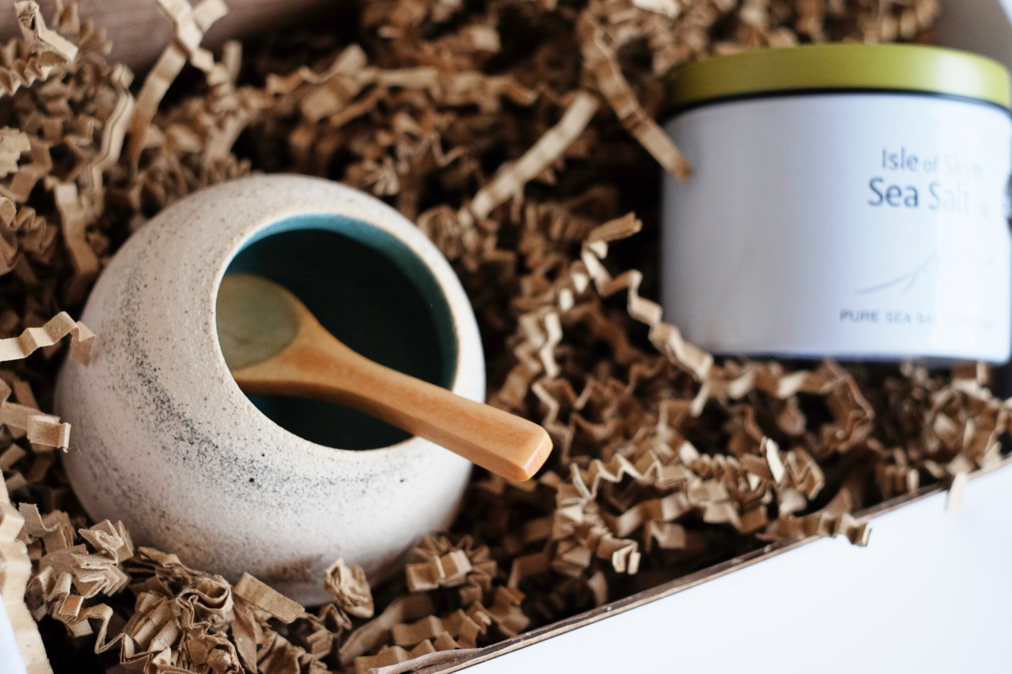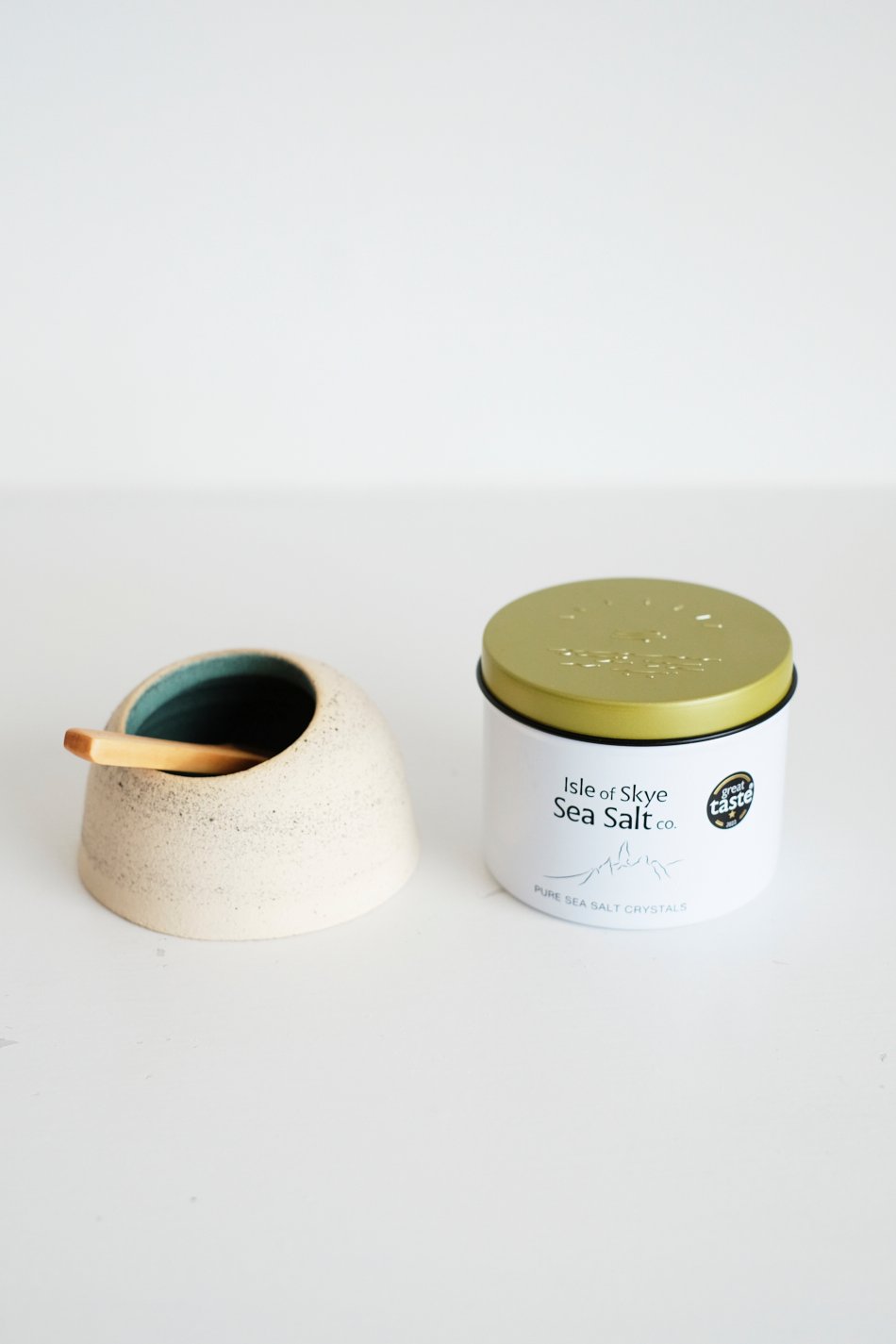 This gift box contains a Waternish sand salt pig, bamboo spoon, 120g tin of Isle of Skye Sea Salt and a mini Cookbook with 3 Skye inspired recipes.