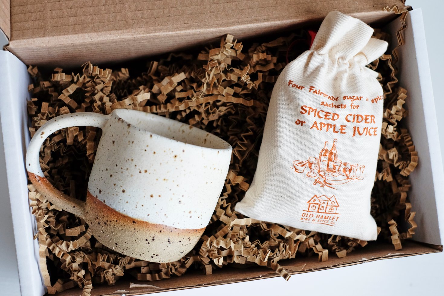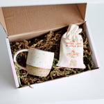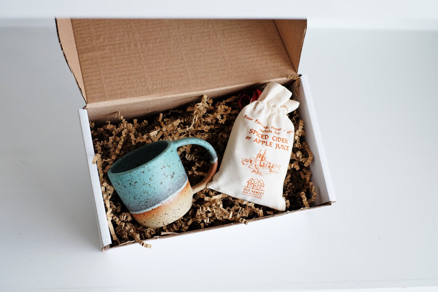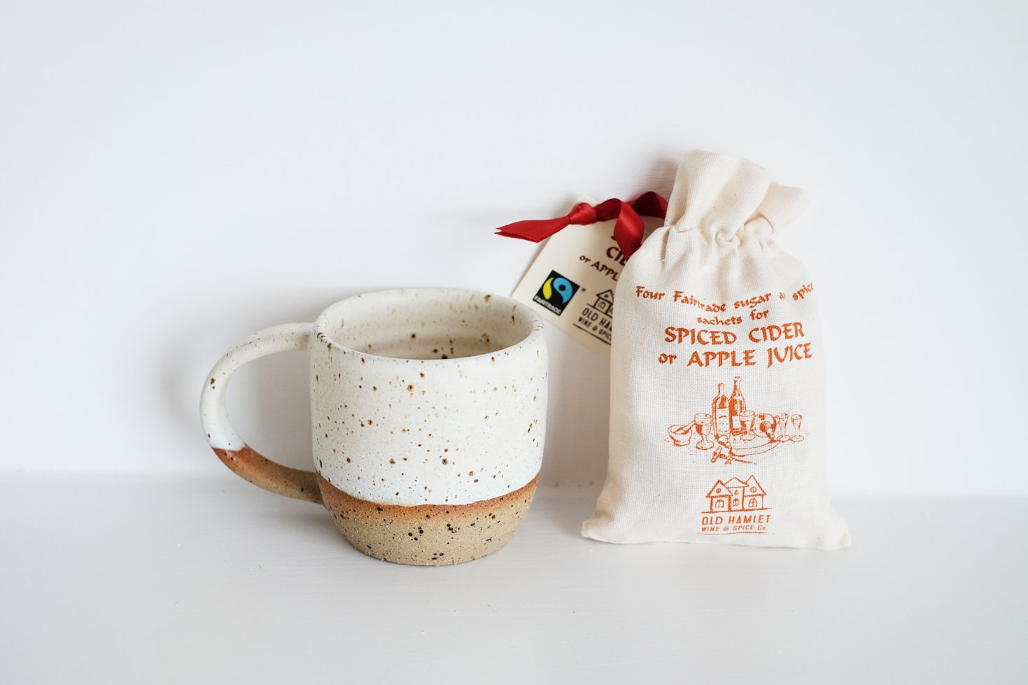 This gift box contains a mug in either Meadowsweet or Coral Beach glaze and a jute bag containing 4 sachets of spice mix for spiced cider or apple juice. If you've attended any of our festive events in the past this is the delicious hot drink we serve, so good!